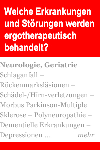 Ergotherapie ist als ein ärztlich verordnetes Heilmittel von allen Krankenkassen anerkannt. Die Therapie unterstützt die Verbesserung und/oder Wiederherstellung verlorener oder gestörter bzw. noch nicht erworbener Funktionen der Motorik, Sensorik und Psyche. Sie stärkt und trainiert die kognitiven Fähigkeiten. Jede Therapie beginnt mit einer gründlichen Befunderhebung. Die Ziele und Vorstellungen des Patienten sind ein wichtiger Bestandteil dieses Befundes, denn jeder Patient wird umfassend beraten und individuell abgestimmt ergotherapeutisch behandelt. Nicht eine einzelne Funktion oder Fähigkeit steht im Vordergrund, sondern der Mensch als Ganzes. Mein Ziel ist es daher nicht nur Funktionenzu verbessern, sondern dem betroffenen Menschen die aktive Teilhabe am Leben in der Familie, der Gemeinschaft und dem Berufsleben wieder zu ermöglichen. Beratung bei der Hilfsmittelversorgung oder Wohnungsanpassung können deshalb ebenso Teil einer Therapie sein, wie das Einüben alltäglicher Handlungen und Verrichtungen. Eine Ergotherapie beginnt in der Regel als Einzeltherapie, kann aber in einer Gruppentherapie fortgeführt werden. Selbstverständlich mache ich Hausbesuche. Im Rahmen der Therapie strebe ich aber an, den Patienten zu befähigen, die Praxis zu besuchen, damit wir deren größere Möglichkeiten nutzen können.